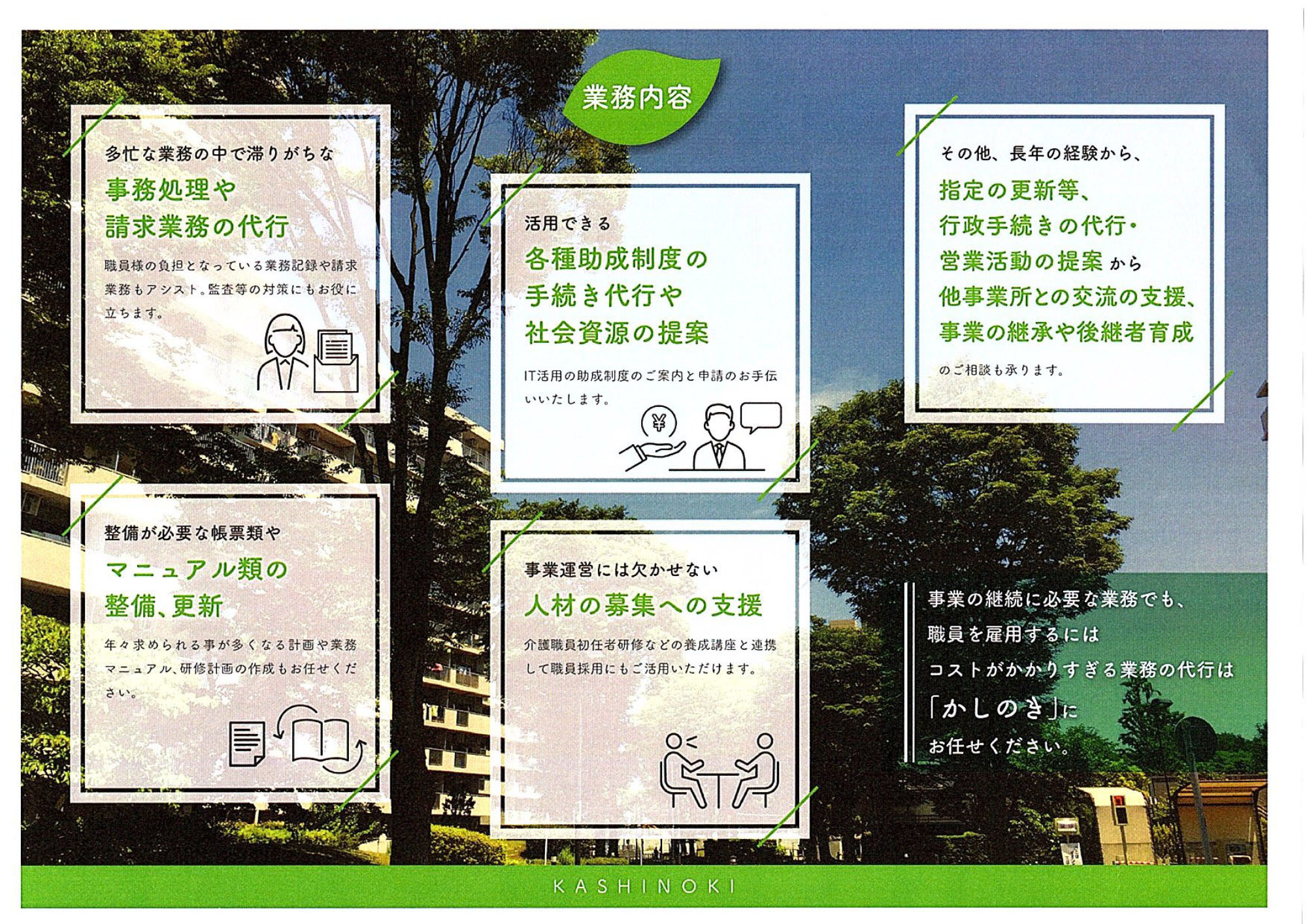 地域の社会福祉に専念できるよう、環境づくりのお手伝いをいたします。事務処理や請求業務の代行マニュアル整備各種助成制度の手続き代行や社会資源の提案 そのほか指定の更新等、行政手続き代行 ・・・